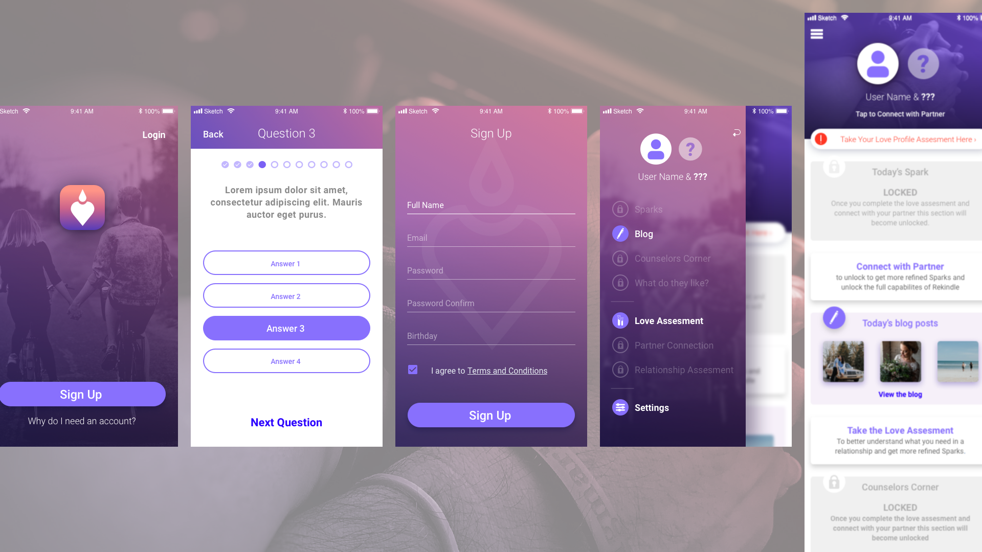 I first started by reading through all of the research that they had already conducted. They had a lot of great content which made it easy on my behalf to break this product down into user groups. I then was able to take those two user personas and build a complex user flow, guiding the user through several minimal assessments that users could take at their leisure. They were rewarded for completing these assessments and unlocking new features of the app, and getting more insight into their partner’s love language. After that, I worked on some wireframes with the clients and built some high-fidelity mock-ups. Once we had a packaged file we could send to the development team, I then worked with them to come up with some branding and identity ideas for their app.