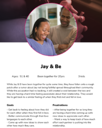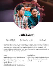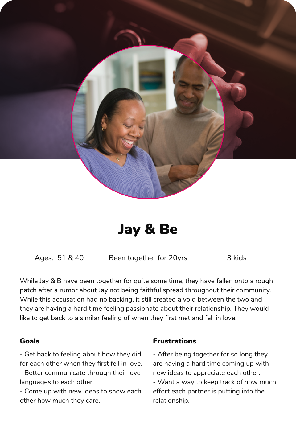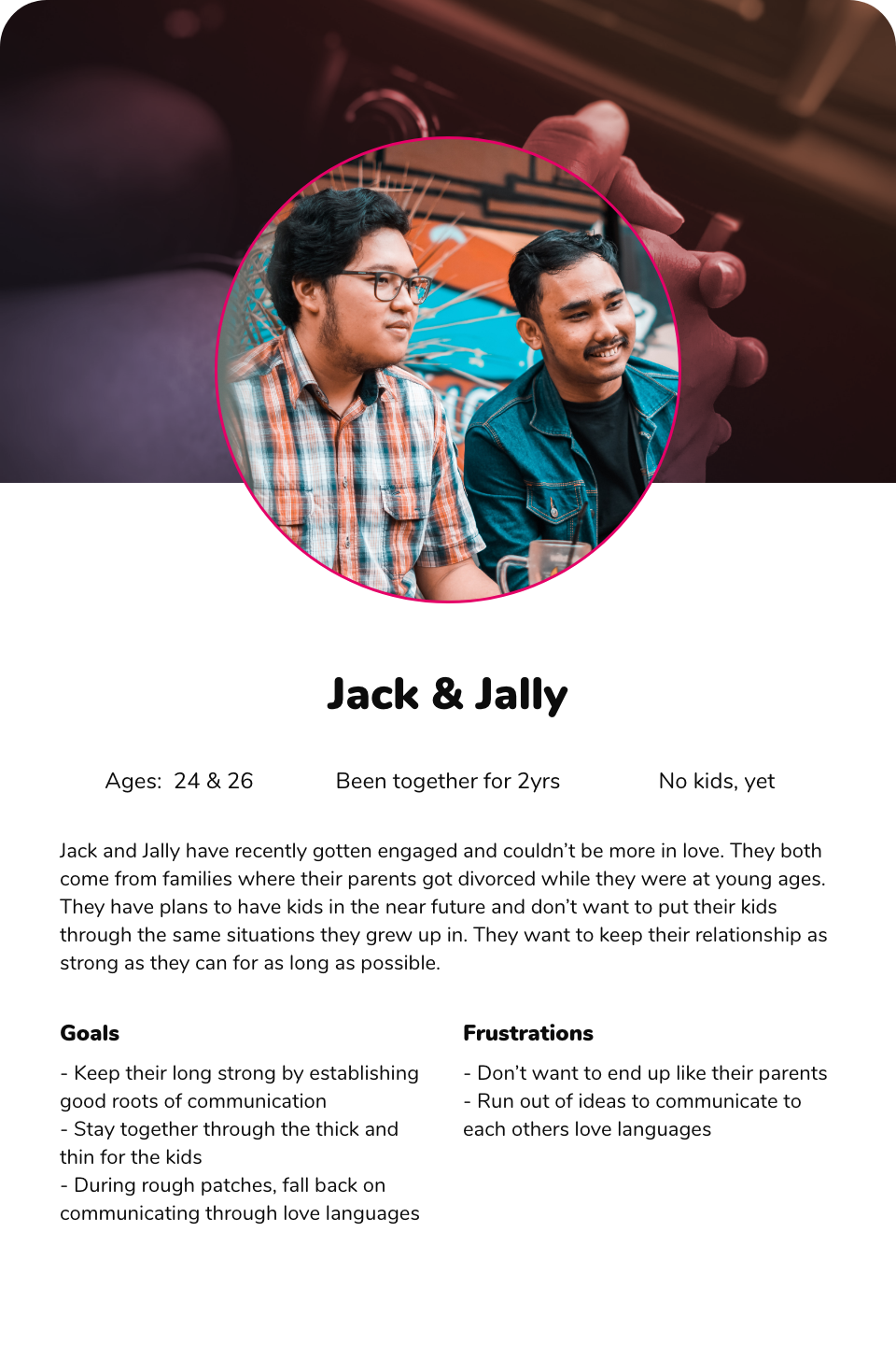 With the research the clients had already done, I was able to build out two user personas. The first is a couple that had recently had a change in their relationship, whether they just got together, or got married after dating for several years. Their relationship is very solid, but they want to find new ways to show how much they care for their partner. The second persona is a couple that has been together for quite some time, they have fallen onto some rocky points and would like to rebuild that love they once felt for each other.